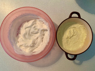 Белки отделите от желтков. Желтки и творог смешайте, добавьте сахар, ванилин, сметану, крахмал и манку. Перемешайте, лучше всего это сделать погружным блендером. Тогда масса получится нежной, без комочков.