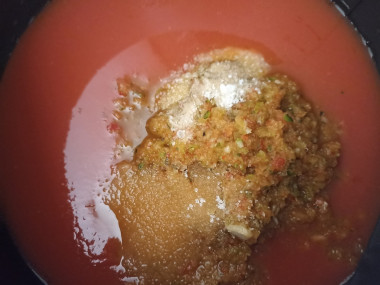 Я в прошлые выходные как раз сделала эту закрутку из помидоров и перца на зиму. Все делала по рецепту: помидоры и перец перекрутила через мясорубку, лук измельчила блендером, как советовали. Варила в обычной кастрюле, помешивала, чтобы не пригорело. Получился густой ароматный соус