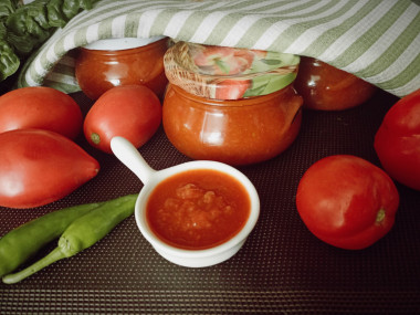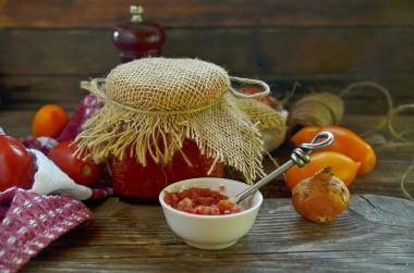 Горячей разложите томатно-перечную массу в стерильные банки и плотно закройте стерильными крышками или закатайте. Переверните банки верх дном, укутайте теплым одеялом, оставьте так медленно и полностью остыть при комнатной температуре. Хранится такая заготовка в прохладном, тёмном и сухом месте, без сквозняков и прямых солнечных лучей: погреб, кладовая или холодильник. После вскрытия банку храните только в холодильнике.