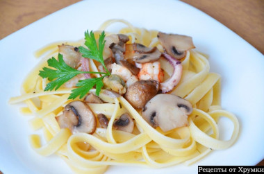 очень люблю морепродукты, а с пастой это просто объедение!!! готовила с морским коктейлем, а так как помидора под рукой не оказалось добавила грибы, получилось очень вкусно и ароматно!