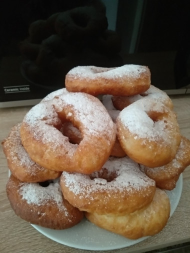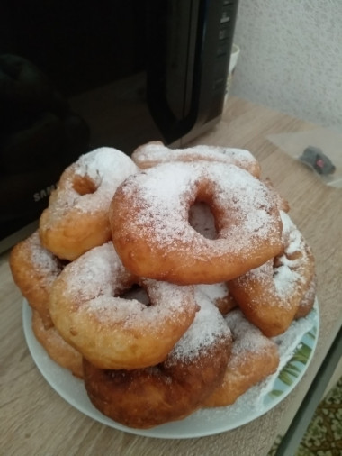Мои первые в жизни пончики. Результат очень неожиданный для меня, на фото, пончики получились хрустящие с наружи и мягкие внутри, вкус как в детстве, помню у нас рядом с домом была пончиковая, мы туда бегали за пончиками, продавцы мне всегда сыпали двойную пудру и стоили они 9 копеек 100гр (ровно три пончика получалось)