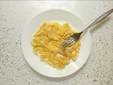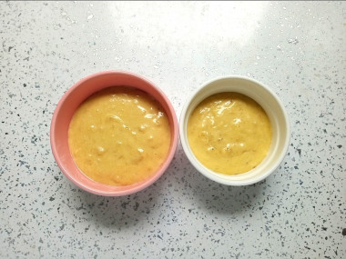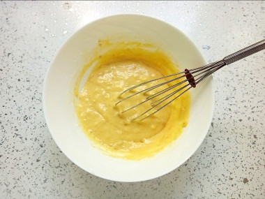 Для этого взяла очень спелый банан с пятнышками на шкурке. Размяла его вилкой, оставив мелкие кусочки. Смешала со сливочным маслом и домашним яйцом. Муки у меня ушло 3 ст. л. с горкой. Тесто замешивала венчиком. Оно получилось как не сильно густая сметана, немного фактурное за счет банана.