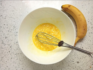 Венчиком (или вилкой, если вы не на кухне) размешайте продукты до однородности. Влейте молоко. Банан очистите и разомните вилкой в пюре. Даже если у вас останутся небольшие кусочки, не страшно — это придаст кексу фактурность. Положите размятый банан в тесто.