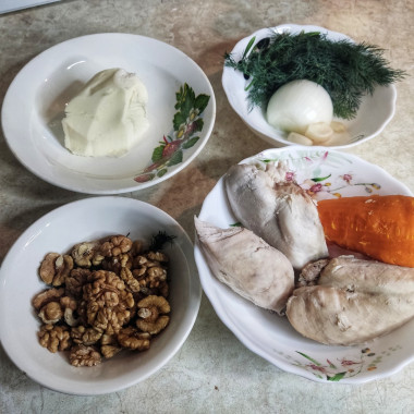 Калорийность продуктов: Куриные грудки, Лук, Морковь, Чеснок, Растительное масло, Сливочное масло, Грецкие орехи, Мускатный орех, Соль, Перец