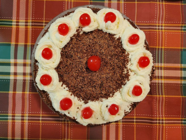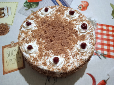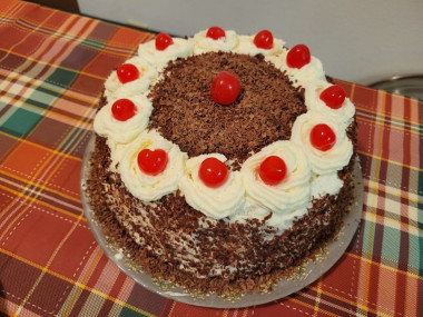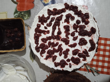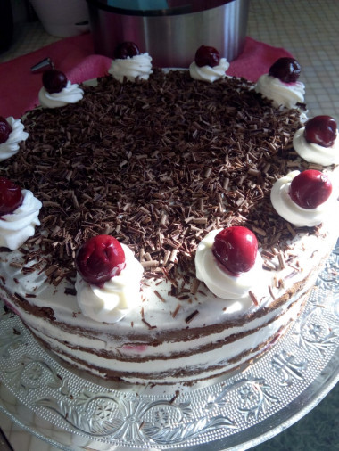 Это один из моих любимых тортов, а также он очень нравится моему мужу. На день влюбленных решила приготовить любимый торт по этому рецепту. Соединила все ингредиенты для приготовления бисквита по описанию в рецепте и испекла шоколадный бисквит. Он очень мягкий и воздушный получился, разрезала на три коржа. Консервированную вишню собственного приготовления откинула на сито. Соком вишни пропитала коржи. Для крема взбила сливки 33% с сахарной пудрой, но без какао. Собирала торт - пропитанный корж, крем и вишня без косточек. Сверху украсила кремом, вишнями и тёртым шоколадом. У меня конечно не так красиво получилось, как у автора, но я старалась. Муж был доволен)