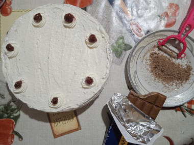 Торт немного обмажьте отложенным кремом по бокам. Затем обсыпьте бока шоколадом. Верх украсьте шапочками крема и коктейльными вишенками, а цент засыпьте шоколадными завитками. Готовый торт поставьте в холодильник на несколько часов, чтобы он застыл и хорошо пропитался.