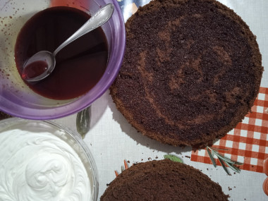 Готовность бисквита можно проверить, проткнув его деревянной шпажкой. Если она останется сухая, то бисквит готов. Готовый бисквит будет немного пружинить при надавливании. Извлеките его из формы, остудите, оберните пищевой пленкой и уберите в холодильник на ночь, чтобы он отлежался. Такой бисквит будет легче резаться. Разрежьте отлежавшийся бисквит на 3 коржа.