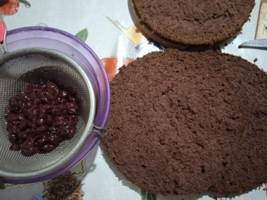 Доведите вишню с сахаром до кипения и проварите 3-4 минуты. Затем остудите. Откиньте на дуршлаг. Вишня пойдет для торта, а оставшимся соком пропитайте бисквитные коржи.