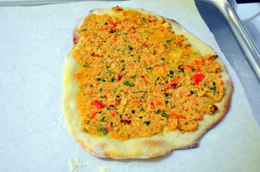 Закусочная лепешка, хороша для перекуса! Лахмаджун по турецки типа пицца с богатой измельченной начинкой. Она такая тонкая, что её можно завернуть рулетом и взять с собой в дорогу. Это очень удобно! Большое спасибо за рецепт!