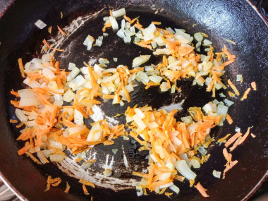 Разогрейте сковороду до горячего состояния, налейте на неё немного растительного масла и выложите измельченные овощи - лук и морковь. Обжаривайте все вместе 2-3 минуты, периодически помешивая. Затем добавьте готовую зажарку в кастрюлю к супу. По вкусу добавьте немного соли и специи.