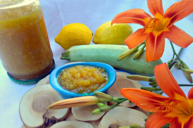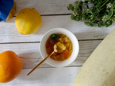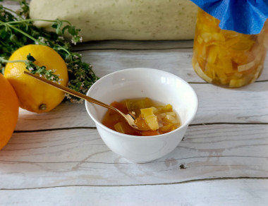 Приготовила варенье из кабачков с лимоном и апельсином. Апельсины почистила и просто порезала дольками. И лимон так же добавила нарезанный. Добавила ещё цедру с цитрусов. Кабачки увариваются, пропитываются сиропом, приобретая апельсиновый вкус. Аромат в процессе варки потрясающий. Варенье получается нежное, неприторное. С указанного количества продуктов у меня получилась поллитровая банка и маленькая пиала на пробу. Мне очень понравилось, люблю десерты из кабачков) Спасибо за рецепт!