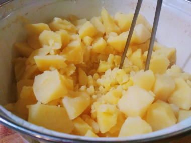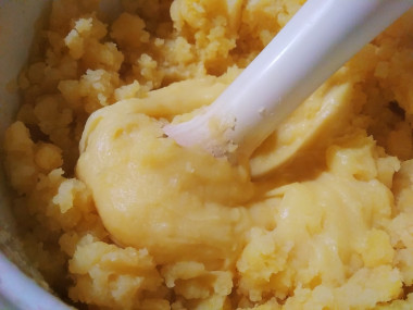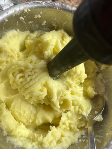 Начинайте измельчать пюре на минимальной скоорости. Лучше всего это делать пульсирующим режимом, чтобы можно было наглядно контролировать степень измельчения. Как только масса стает однородной консистенции, заканчивайте процесс, чтобы масса не стала клейкой. Использовать для этой цели стационарный блендер я не рекомендую. Так как при таком активном взбивании пюре превратится в клейстер. А всему виной будет наличие крахмала в картофеле.