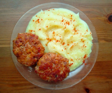 У меня нет подходящего блендера, заменила его миксером с насадкой "венчики". Начинаю взбивать картофель на медленной скорости, постепенно увеличиваю ее. Получается нежный, воздушный гарнир, который просто тает во рту и подходит практически к любому мясному/рыбному/овощному блюду. Сегодня у меня котлеты. Для придания пюре дополнительной пикантности, добавила немного копчёной паприки.