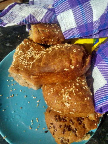 Когда булочки подошли, посыпьте их кунжутом и ставьте на среднюю полку заранее разогретой до 220 градусов духовки. Чтобы духовка успела нагреться до нужной температуры, включите её заранее (минут за 20 до начала выпекания). Через 15 минут уменьшите температуру до 200 градусов и выпекайте еще примерно 15 минут. Точное время зависит от возможностей вашей духовки. Готовые булочки достаньте из формы, накройте полотенцем и остудите.
