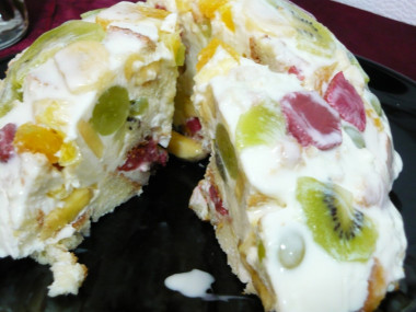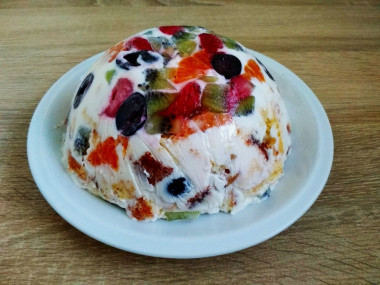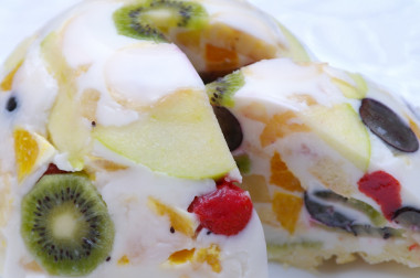 Очень понравился мне этот торт без выпечки с желатином и фруктами! У меня был тонкий бисквитный корж, 20%-ная сметана и фрукты. Сразу было понятно, что мандарины и замороженная клубника потеряют форму в таком тортике, но я готовила его для обычного домашнего чаепития, поэтому на этот счет сильно не заморачивалась и использовала все фрукты, что нашла в холодильнике))) Готовить такой торт несложно, всё очень подробно и точно описано в рецепте автором. Но я бы отметила всё же два момента. Во-первых, чтобы соединить распущенный желатин со сметаной, эти продукты должны быть примерно одинаковой комнатной температуры, в противном случае теплый желатин может свернуться хлопьями в охлажденной сметане. Во-вторых, очень удобно нарезанные фрукты и кусочки бисквита сразу перемешать со сметанно-желатиновым кремом в отдельной миске, а затем поместить в форму - так все продукты более плотно прилипнут друг к другу и не будет пустот и рыхлости в разрезе. Но внешний вид тортика в этом случае пострадает, придется как-нибудь украшать его сверху - чем-то присыпать или полить. Ну и, конечно, если я буду готовить такой торт на торжество или для гостей, то более серьёзно отнесусь к выбору самих фруктов и ягод, они должны хорошо держать форму, не пускать лишний сок и в то же время быть пластичными при разрезе торта на порции. Торт (вернее два небольших тортика) получился очень вкусным, очень понравился мужу и дочери. Обязательно буду готовить такой ещё, особенно в сезон свежей клубники и персиков. Спасибо за рецепт!!