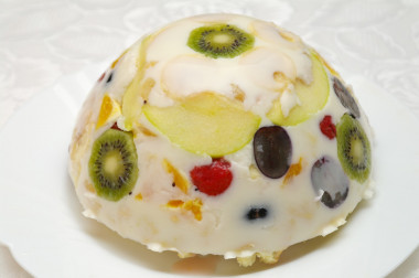 Осталось только вылить её в миску поверх фруктов. Торт оставьте при комнатной температуре полностью остыть, а затем затяните верх пищевой плёнкой и уберите миску в холодильник на ночь для стабилизации.
