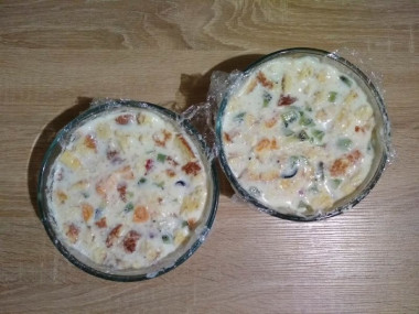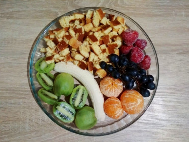 Возьмите глубокую миску, которую мы будем использовать в качестве формы для торта, и застелите её пищевой плёнкой в два слоя, крест-накрест. В миске распределите фрукты и кусочки бисквита, чередуя их между собой так, как подскажет вам фантазия. Накройте миску и пока отставьте на время.