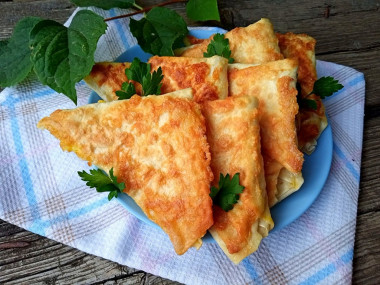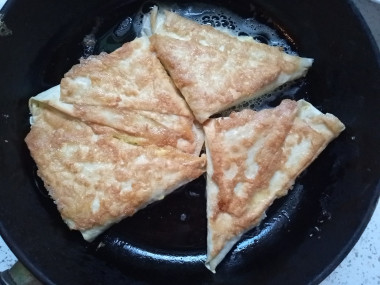 Эти замечательные пирожки из лаваша с сыром на сковороде очень меня выручили. Весь день занималась закаткой фруктов и овощей, не было времени приготовить ужин. А когда вечером дети пришли на кухню и спросили что будем кушать... вот тут я и вспомнила, что у меня в заначке есть лаваш) Лаваш был в виде длинного прямоугольного рулона. Я его разрезала на шесть широких полосок. Для начинки нашла в морозилке натертый сыр. Добавила к нему небольшой пучек зелени, перемешала и распределила по полоскам лаваша. Пока грелась сковородка сворачивала треугольники. Свернула плотно, чтобы начинка не выпала. Обжариваются такие пирожки быстро! Кстати одного яйца мне вполне хватило, даже ещё немного осталось, на один пирожок точно хватило бы) Ели мы пирожки из лаваша горячими со свежими огурчиками и помидорами. Это очень вкусно и очень быстро. Корочка получилась хрустящая, а внутри несколько слоёв "теста" и расплавленный сыр. Спасибо за этот нужный рецепт! Рекомендую!