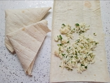 Возьмите лаваш. Нарежьте его на длинные полоски. Примерный размер для небольших пирожков - это 9-10 см в ширину и 40-50 см в длину. Тогда начинка будет завернута надежно и не вытечет при обжаривании. Резать лаваш удобно ножницами.