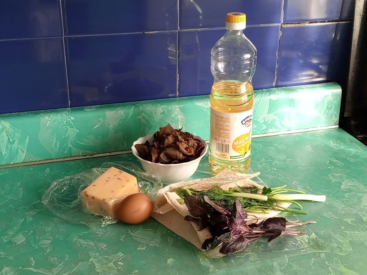 Как сделать пирожки из лаваша с яйцом и сыром на сковороде? Подготовьте продукты. Из одного листа тонкого лаваша выйдет 4 небольших пирожка. Сыр берите такой, который хорошо плавится. Зелень также выбирайте на свой вкус. У меня свежей не оказалось, я взяла замороженную петрушку и фиолетовый базилик.