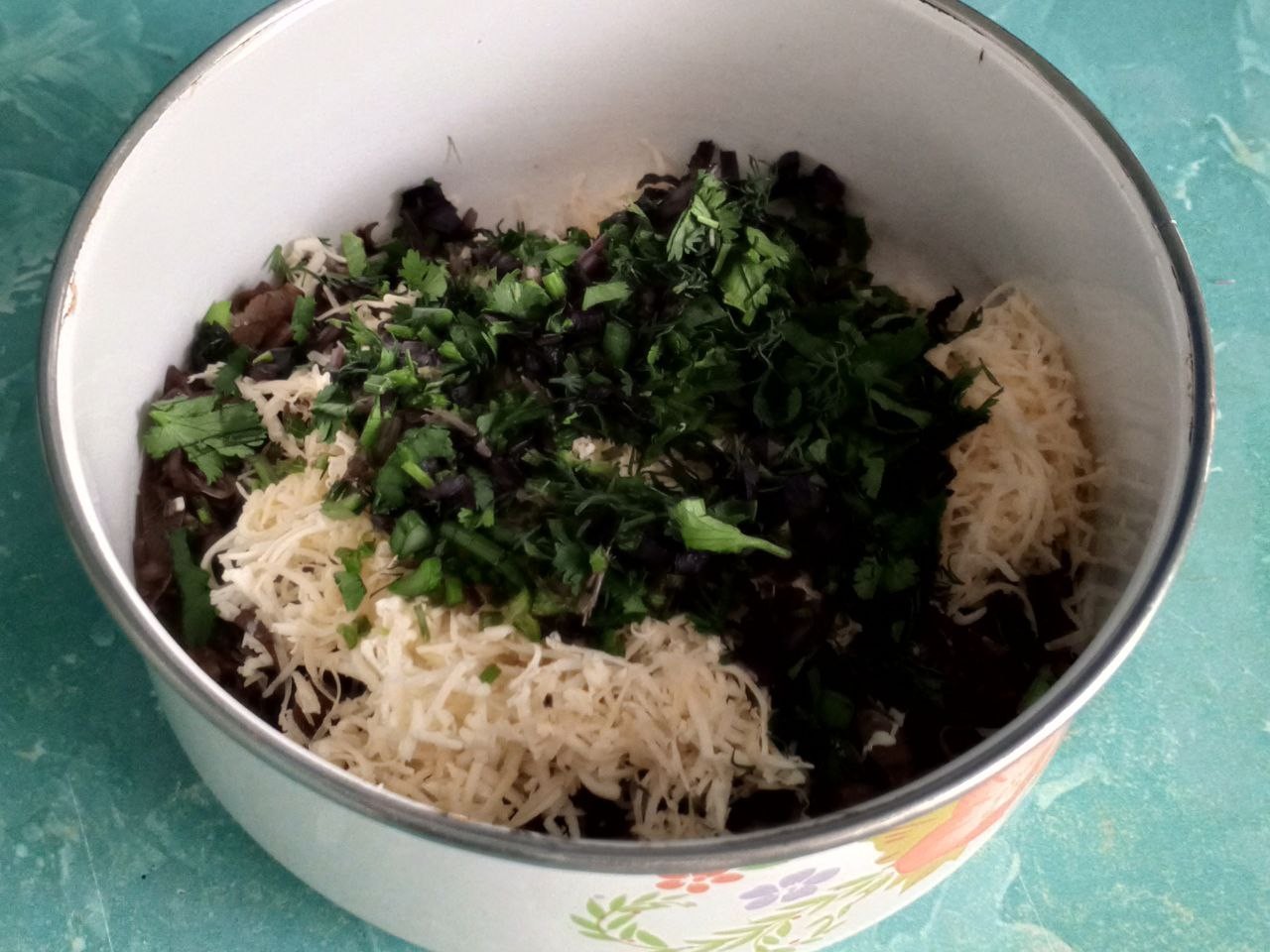 Соедините сыр и зелень. Перемешайте. Начинка готова.