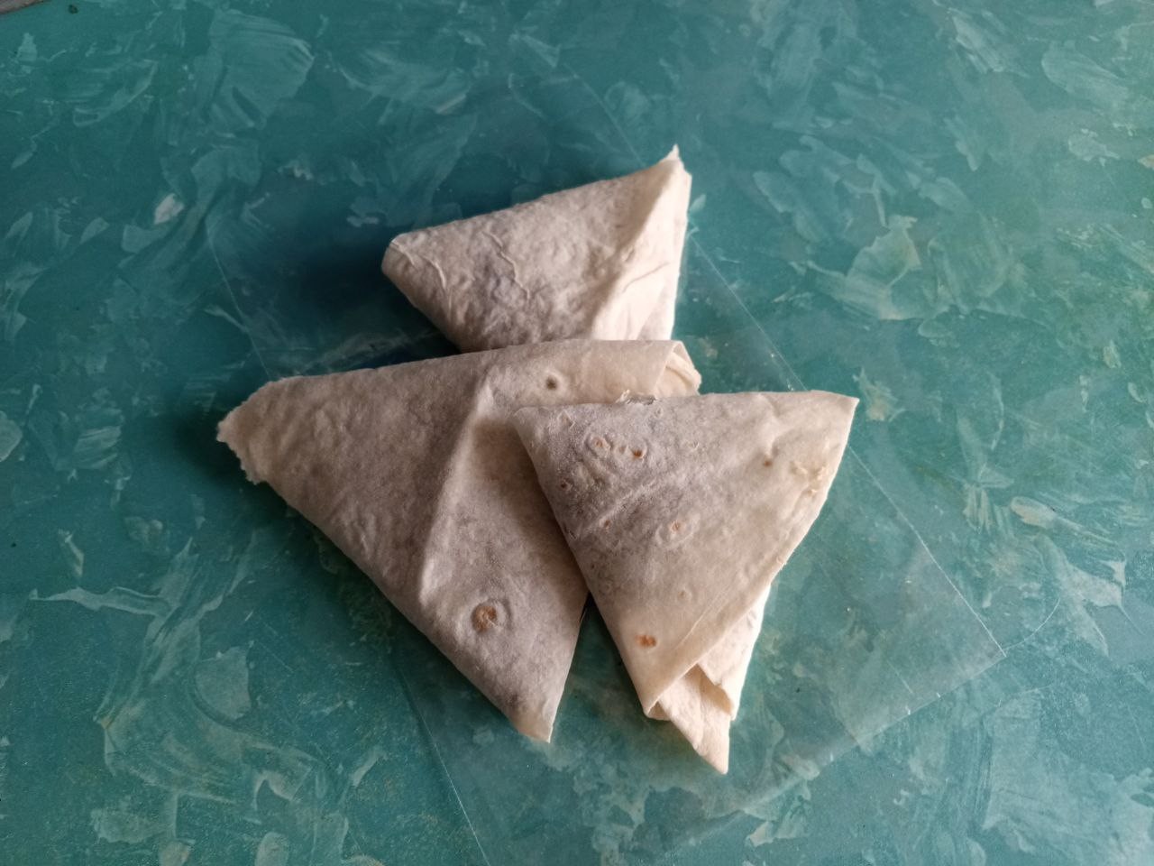 Начните заворачивать лаваш, загибая с каждым поворотом треугольник.