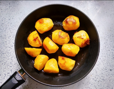 Выложите картофель и, периодически перемешивая, обжарьте со всех сторон на среднем огне до румяной корочки.