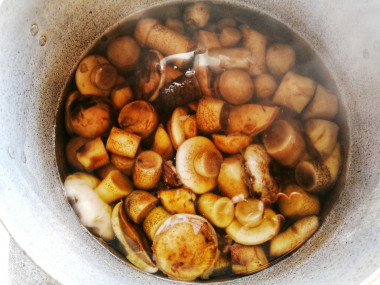Положите отварные грибы, с которых стекла вода, доведите до кипения. Варите в течение 20 минут на медленном огне.