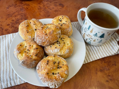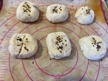 Посыпаем булочки сверху кунжутом по вкусу и ставим противень в разогретую до ста семидесяти пяти градусов духовку на двадцать-двадцать пять минут.