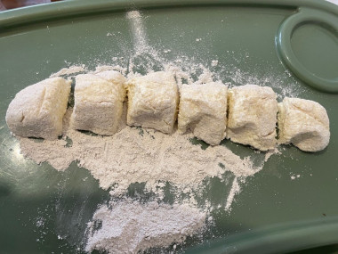 Делим сформированное в форме колбасы тесто на десять примерно одинаковых кусочков.