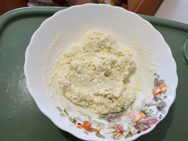 В подходящую миску выкладываем четыреста граммов творога, после чего высыпаем в нее одну треть чайной ложки соли.