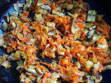 Приготовьте зажарку классическим способом. Луковицу очистите от шелухи и нарежьте ее кубиками, морковь очистите и натрите на крупной терке. Подготовленные овощи переложите на сковороду, добавьте немного растительного масла и слегка обжарьте овощи до мягкости. Зажаривать сильно овощи не надо.