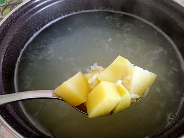 С помощью овощечистки очистите картофель, нарежьте его кубиками или брусочками, и когда рис будет на половину готов, добавьте картофель в бульон.