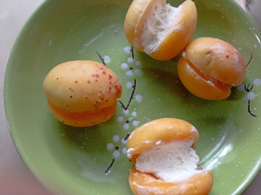 Заполните творожной начинкой половинки абрикоса так, чтобы места соединения стенок абрикоса оставались чистыми. Так улыбка из абрикосов получится аккуратной и красивой.
