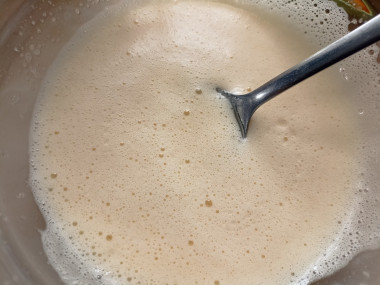 В отдельную емкость просейте муку, чтобы отсеять мелкий мусор и тесто насытилось кислородом. Добавьте к муке разрыхлитель и перемешайте, чтобы он равномерно разошелся по муке. По-немногу добавляйте муку в жидкую составляющую теста и перемешивайте ложкой или лопаткой аккуратно в одном направлении, чтобы не нарушить воздушную структуру взбитых яиц. Добавляйте муку пока тесто не станет по консистенции как очень густая сметана, чтобы начинка не "тонула" в нем.