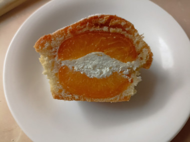 Сверху аккуратно, чтобы не сдвинуть половинки, залейте небольшим слоем теста, чтобы только покрыть начинку. Выпекайте примерно 30 минут на средней полке духовки при температуре 180 градусов. Учитывайте, что время приготовления зависит от вашей духовки и размеров форм. Готовые кексы поднимутся и зарумянятся. Доставая из форм, сделайте ножом маленькую засечку в том месте кекса, в котором нужно будет разрезать, чтобы получить улыбку из абрикоса на срезе.