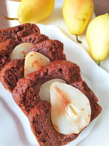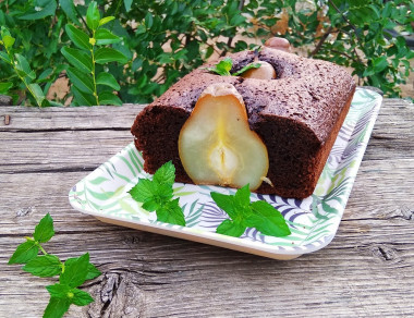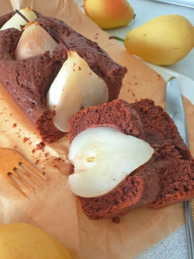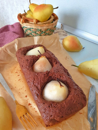 Увидев такой необычный шоколадный кекс, сразу захотелось его приготовить! Его подача и вид меня вдохновили. Ну, и само собой на вкус он оказался восхитительным! За счет сочных груш, которые располагаются в самом кексе, бисквит получается очень влажным и не сухим. И очень необычное сочетание груши(кстати на вкус похожую, как из компотов)и шоколадного бисквита это просто класс! Для данного рецепта я решила очистить груши от кожуры и немного отварила их в подслащенной воде со специями(гвоздика, немного корицы и мускатного ореха), чтобы они дали свой сок и аромат в бисквит при выпечке. И да, я с этим не прогадала! Получилось все как я и хотела, так как делала на свой вкус! Ну, а сам кекс получился нежным, мягким, воздушным и очень шоколадным!Это очень вкусно, буду делать ещё!