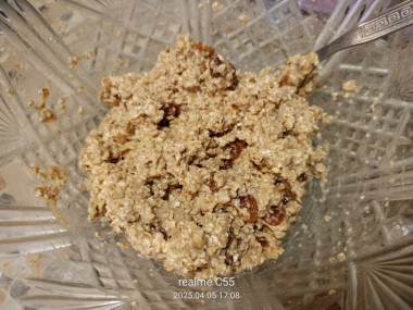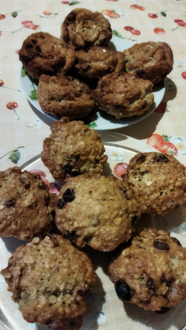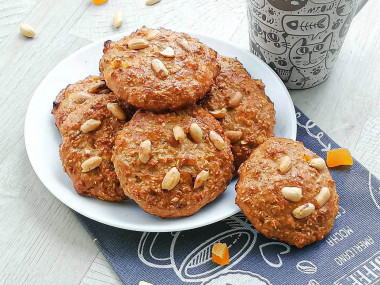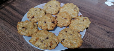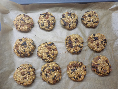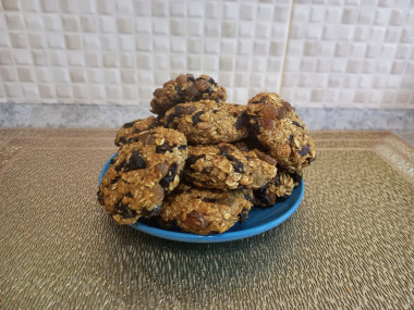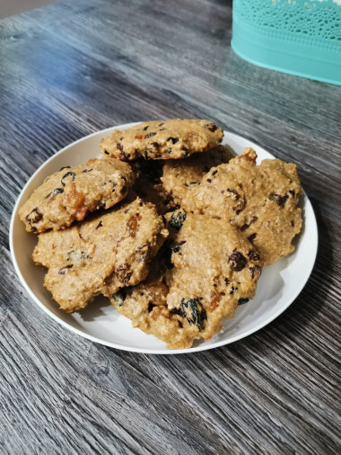 Этот ПП рецепт меня заинтересовал сразу. Во-первых, я люблю овсяное печенье, но покупаю редко, так как полезным назвать выпечку из магазина сложно. А во-вторых, в составе рецептуры отсутствует пшеничная мука и сахар, что полезно. Можно есть сколько душе угодно и не переживать за фигуру! Цельную овсяную крупу перемолола в кофемолке в муку, а также добавила в тесто пару ложек овсянки крупного помола для фактурности. Из сухофруктов использовала изюм и мелко нарезанную курагу. А вот грецких орехов в доме не оказалось, потому сверху на печенье выложила очищенный арахис и вкусно, и украшение. Из указанного количества ингредиентов у меня получилось 8 шт печенья. Вкусно с компотиком, молоком или чаем. Спасибо автору за полезные вкусняшки