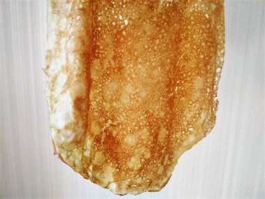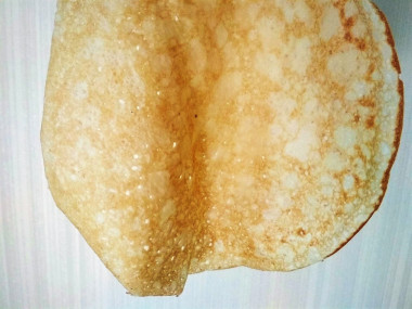 Жарим блин с одной стороны до зарумянивания и переворачиваем на другую. Дожариваем. Огонь делаем сильный, чтобы блины не успевали пересыхать. Используем все тесто.