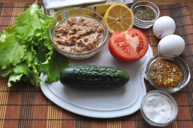 Как сделать ПП салат из тунца? Подготовьте продукты. Тунец берите в собственном соку, а не в масле. Этим мы снизим калорийность салата. Яйца предварительно отварите и остудите. Вместо черри можно взять крупные помидоры, их тогда понадобится 2 штуки. Овощи предварительно помойте. Горчицы берите не острую, а такую, которую вкусно есть. Я взяла с зернышками.