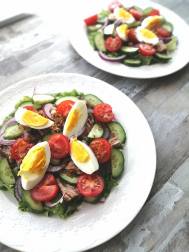 Я считаю, что этот салат можно считать рецептом правильного питания, потому что в нем сбалансированы основные источники полезных веществ - белки, за которые отвечает тунец и яйца, и клетчатка, за которую отвечают свежие овощи. За жиры, в которых также нуждается человек, следящий за своим питанием, отвечает оливковое масло. Берите его самого высокого качества, первого отжима.