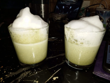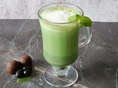 Если напиток долго стоит, более тяжелый зеленый чайный осадок опускается на дно и латте четко делится на три части: ярко-зеленую чайную, бледно-зеленую молочную и бело-зеленую пенку. Получается очень красиво и эффектно. Для смешивания всех слоев, нужно просто перемешать напиток ложкой.