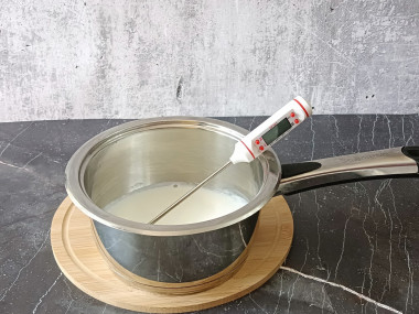 В другой сотейник влейте воду и также нагрейте на среднем огне до 80°С. Воду лучше используйте нейтральную по вкусу фильтрованную или бутилированную. Вода из-под крана может придать блюду неприятный характерный привкус. Чтобы нагреть воду и молоко до нужной температуры и не перегреть, используйте кулинарный термометр.