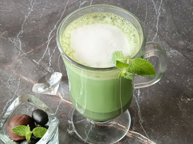 Взяла всё ингридиенты по рецепту, заварила порошок матча и залила горячим взбитым в пышную пену молоком. Вот и всё, вкусный, сытный и бодрящий напиток готов.