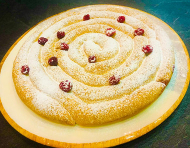 Запекайте пирог в духовке при 200 градусах до образования золотистой корочки. Готовый пирог немного остудите, посыпьте сахарной пудрой, украсьте свежими ягодами и можно подавать его к столу. Он вкусен как в горячем, так и в холодном виде.