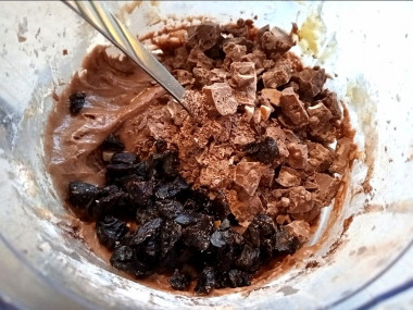 Добавьте в тесто чернослив вместе с коньяком, порезанный на маленькие кусочки шоколад и ещё раз перемешайте все лопаткой. Чернослив и шоколад должны равномерно распределиться по тесту.