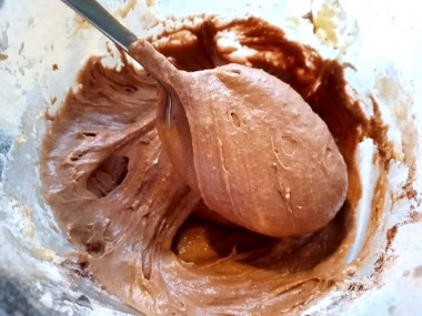 Всыпьте просеянную муку с какао и разрыхлителем и перемешайте миксером.