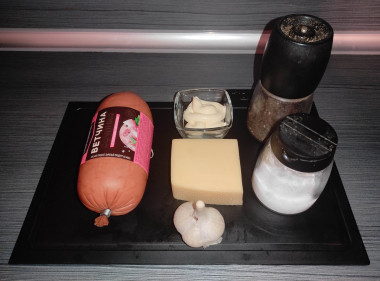 Была у меня только варёная колбаса. С ней и готовила рулетики. Нарезала колбасу на слайсере на тонюсенькие кружочки. Вместо майонеза использовала соус Айоли. Это чесночный соус, так что чеснок к сыру добавлять не пришлось.