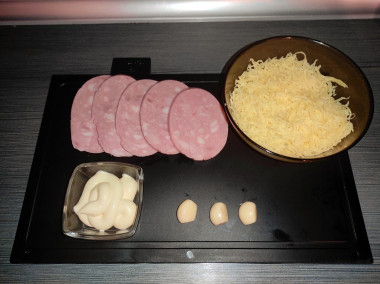 Отмерьте все перечисленные в рецептуре ингредиенты. Какую правильно выбирать ветчину? Проверьте состав на наличие сои, крахмала и ароматизаторов. Натуральная ветчина готовится из свинины. Другие виды мяса в составе нежелательны. Удобно купить готовую нарезку, так ломтики будут одинакового размера, формы и толщины. Или нарежьте ее самостоятельно на тонкие кружочки толщиной не более 2-3 мм. Если нарезать ломтики толще, при скручивании они будут ломаться.