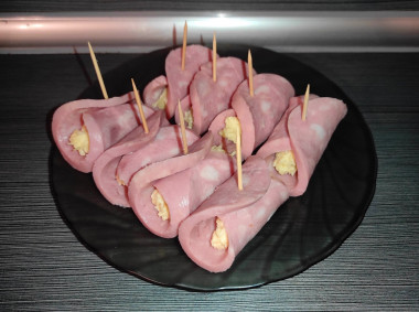 Сверните ветчину трубочкой. Сформируйте таким образом остальные рулетики. Выложите их на блюдо швом вниз. Чтобы рулетики не распались, свяжите их перышками зеленого лука или скрепите зубочистками. Отправьте закуску на 10 минут в холодильник для пропитки. Приятного аппетита!
